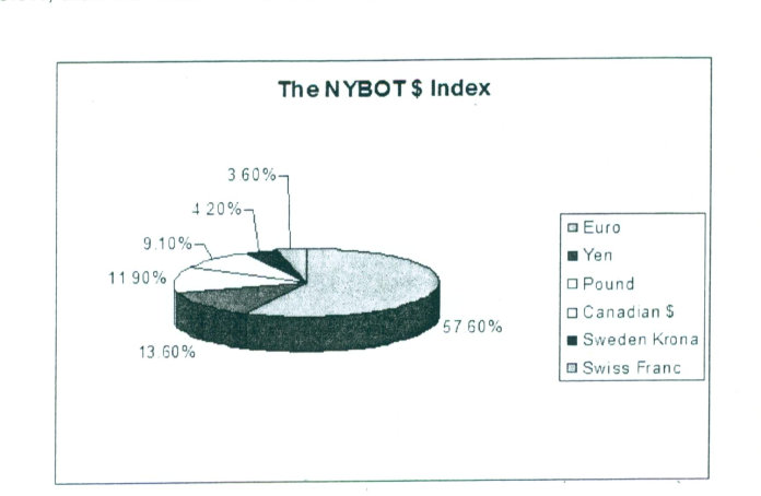 The chart below in Figure 2 shows a breakdown of the various currencies and their respected weights on the average. The top four include the Euro Currency, which is the heaviest weight with 57.6%, then followed by the Japanese Yen with 13.6%, then the British Pound with 11.90% and the Canadian Dollar with 9.10%.