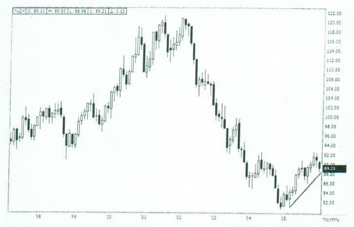 As you can see from the Dollar Index weekly chart in figure 1, on a year to year basis, the Dollar did make an outstanding run. However keep in mind the Dollar was at a high of 120.80 back in 2002, so depending on where Warren was shorting the Dollar, he could still be in a lucrative or profitable position. The focus of this example is how shifts in monetary and fiscal policies can and do dictate price swings in the market, as happened in 2005.