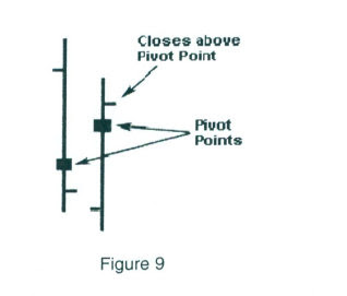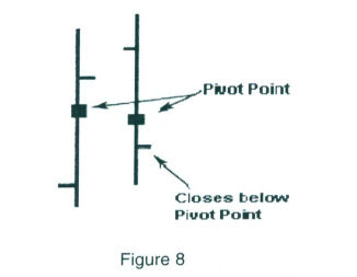 Another method, which is more in line with my moving average methodology, is if the close is below the prior time period’s close, and closes below the open and below the Pivot Point, then the next time period should be considered as a bearish trading session. In figure 8, the square boxes represent the value of that time period’s Pivot Point.