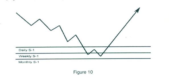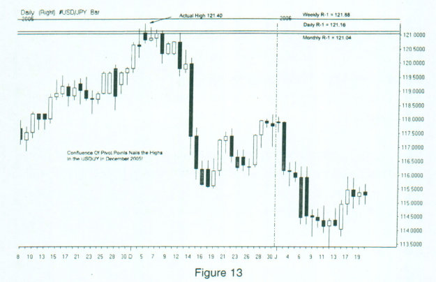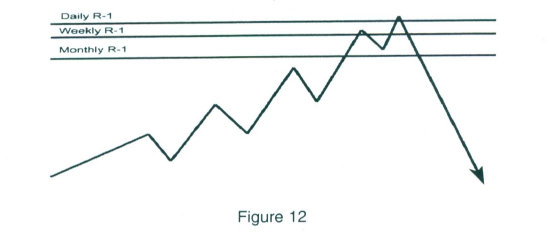 In the illustration in figure 12, once again the three main time periods that we use are the monthly, the weekly, and the daily. When a congestion of Pivot numbers line up or cluster near a specific price zone, heighten your awareness for possible reversals.